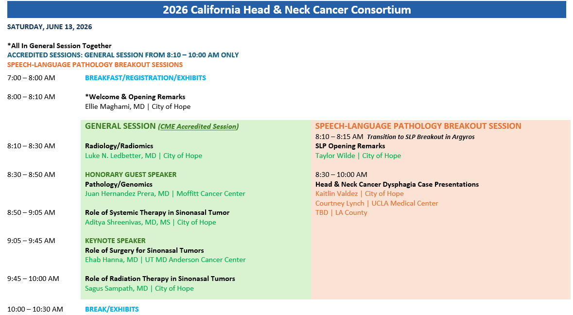 City of Hope is pleased to offer the opportunity to exhibit and/or sponsor the 2026 California Head & Neck Cancer Consortium, an ACCME accredited consortium focused on enhancing interprofessional collaboration among surgeons, oncologists, radiologists, pathologists, dentists, primary care teams, speech-language pathologists, and supportive care providers. It is the place to highlight the latest advancements in science, technologies and procedures!